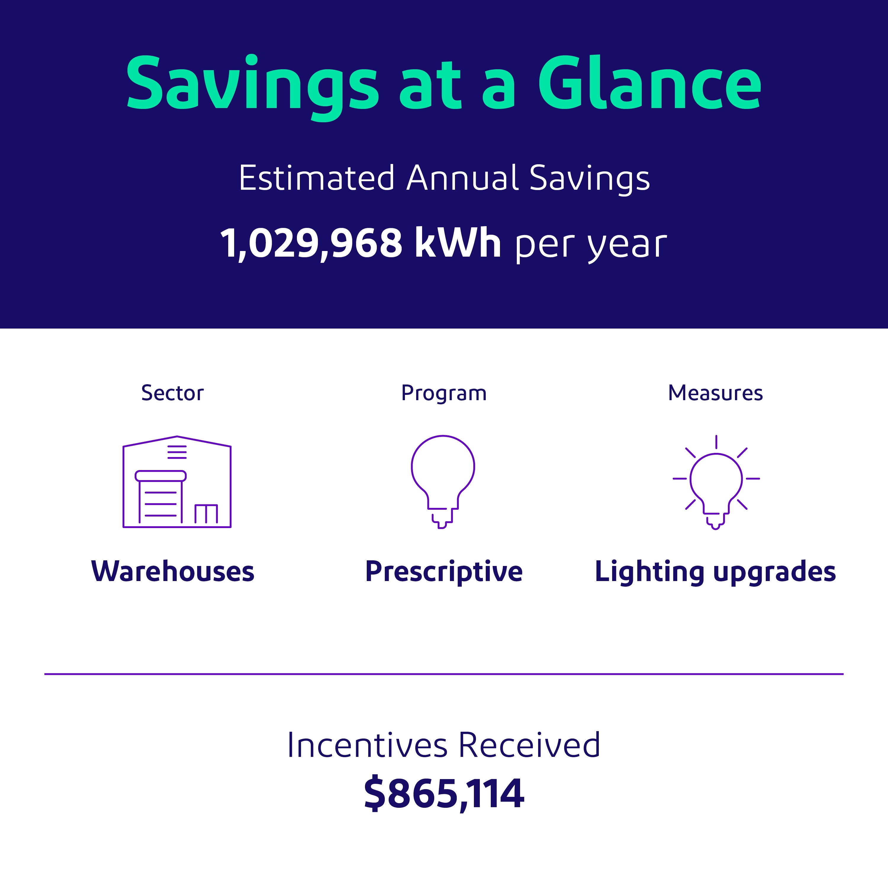 Vast Distribution Center Takes Stock of Lighting IncentivesA chain of specialty discount stores with most prices set at $5 or less, Five Below has more than 1,600 stores in 43 states. Five hundred of those stores—from Maine to Virginia—are serviced by a distribution center in Pedricktown, N.J., known as ShipCenter NJ. As the highest volume facility in the Five Below distribution system, ShipCenter NJ uses 1 million square feet of space. Needless to say, its lighting demands are extraordinary.The OpportunityFaced with the impending end-of-life failure of many of the facility’s bulbs and ballasts, ShipCenter NJ spent months looking for cost-effective lighting upgrade options. The search was unsuccessful until Smart Start Lighting, an Atlantic City Electric Trade Ally, reached out to discuss upgrades and available incentives.The UpgradesSmart Start Lighting upgraded every fixture in ShipCenter NJ’s 1-million-square-foot building. All 3,000 fixtures were replaced without any interruption to the facility’s operations. “Smart Start Lighting and their subcontractors worked around our crew members, and it was fairly seamless,” said Malovich.The ResultsIn terms of employee relations and aesthetics, ShipCenter NJ noticed a difference immediately. “The building feels more vibrant and alive,” noted Malovich. Plus, these lighting upgrades have made the company more environmentally responsible, reducing its carbon footprint by about 40%.Experience the success firsthand.Atlantic City Electric’s Prescriptive and Custom programs offer incentives on a wide variety of energy-efficient equipment. Prescriptive incentives are available on lighting and controls, HVAC systems, variable frequency drives, food service equipment, agriculture equipment, and more. If the Prescriptive program doesn’t have what you’re looking for, the Custom program can cover your unique or complex needs.(opens in a new tab)Explore our Programs (opens in a new tab)Find a Trade Ally